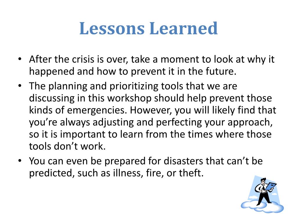 Lessons Learned • After the crisis is over, take a moment to look at why it happened and how to prevent it in the future. • The planning and prioritizing tools that we are discussing in this workshop should help prevent those kinds of emergencies. However, you will likely find that you’re always adjusting and perfecting your approach, so it is important to learn from the times where those tools don’t work. • You can even be prepared for disasters that can’t be predicted, such as illness, fire, or theft.