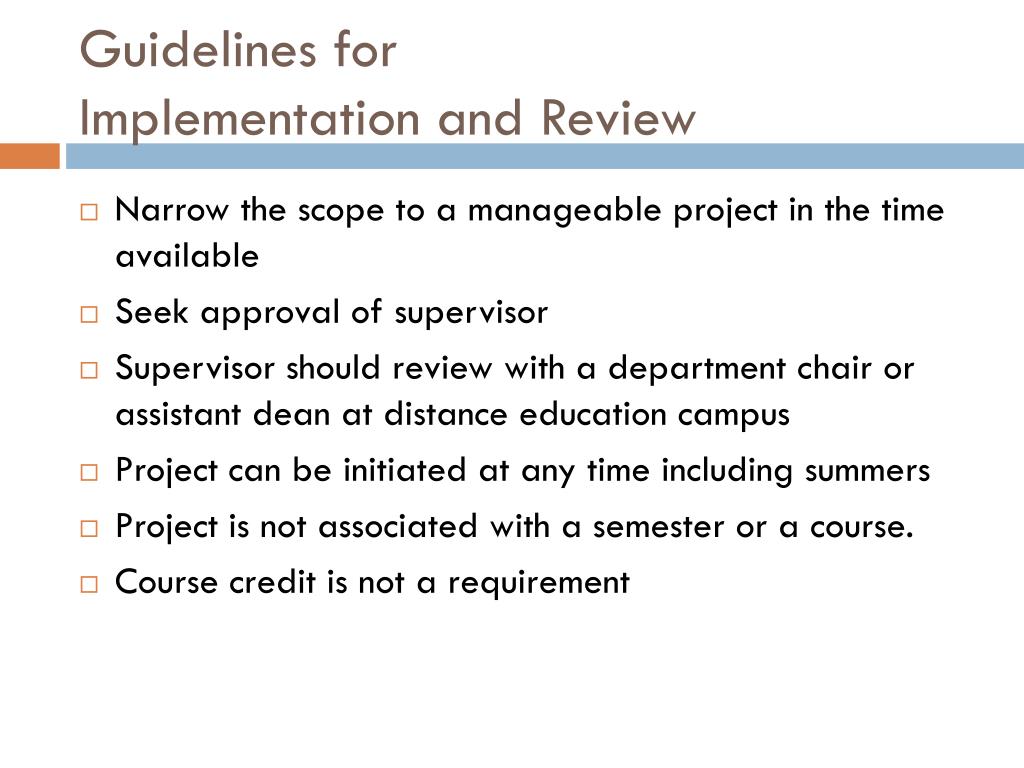 Guidelines for Implementation and Review • Narrow the scope to a manageable project in the time available • Seek approval of supervisor • Supervisor should review with a department chair or assistant dean at distance education campus • Project can be initiated at any time including summers • Project is not associated with a semester or a course. • Course credit is not a requirement