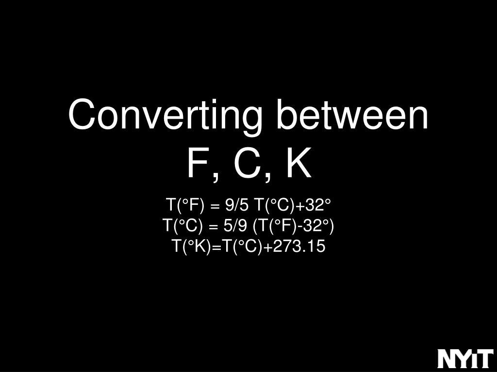 Converting between F, C, K T(°F) = 9/5 T(°C)+32° T(°C) = 5/9 (T(°F)-32°) T(°K)=T(°C)+273.15
