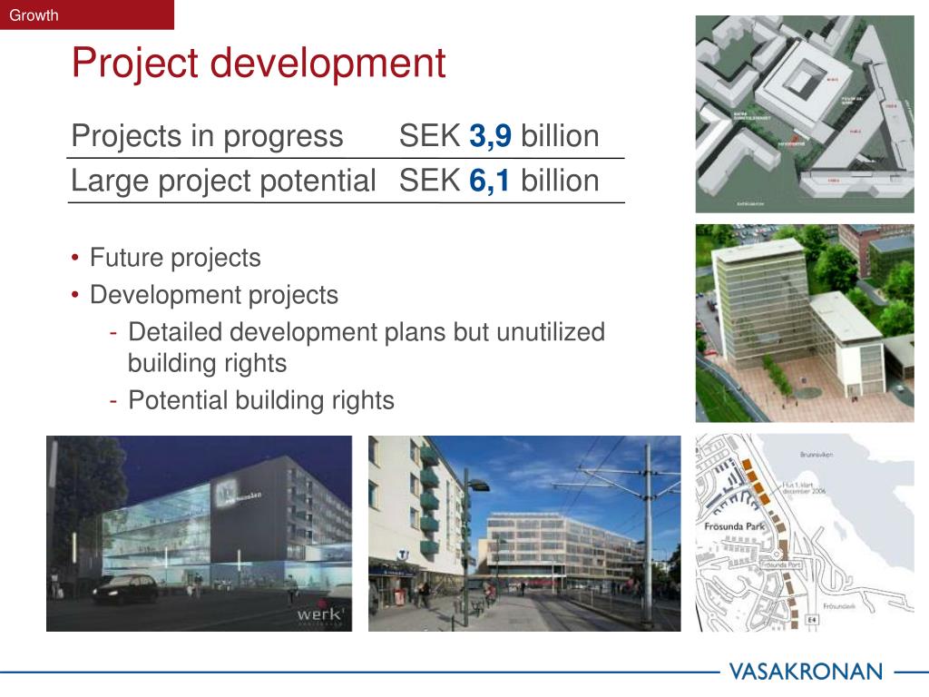 Growth Project development Projects in progress SEK 3,9 billion Large project potential SEK 6,1 billion • Future projects • Development projects • Detailed development plans but unutilized building rights • Potential building rights
