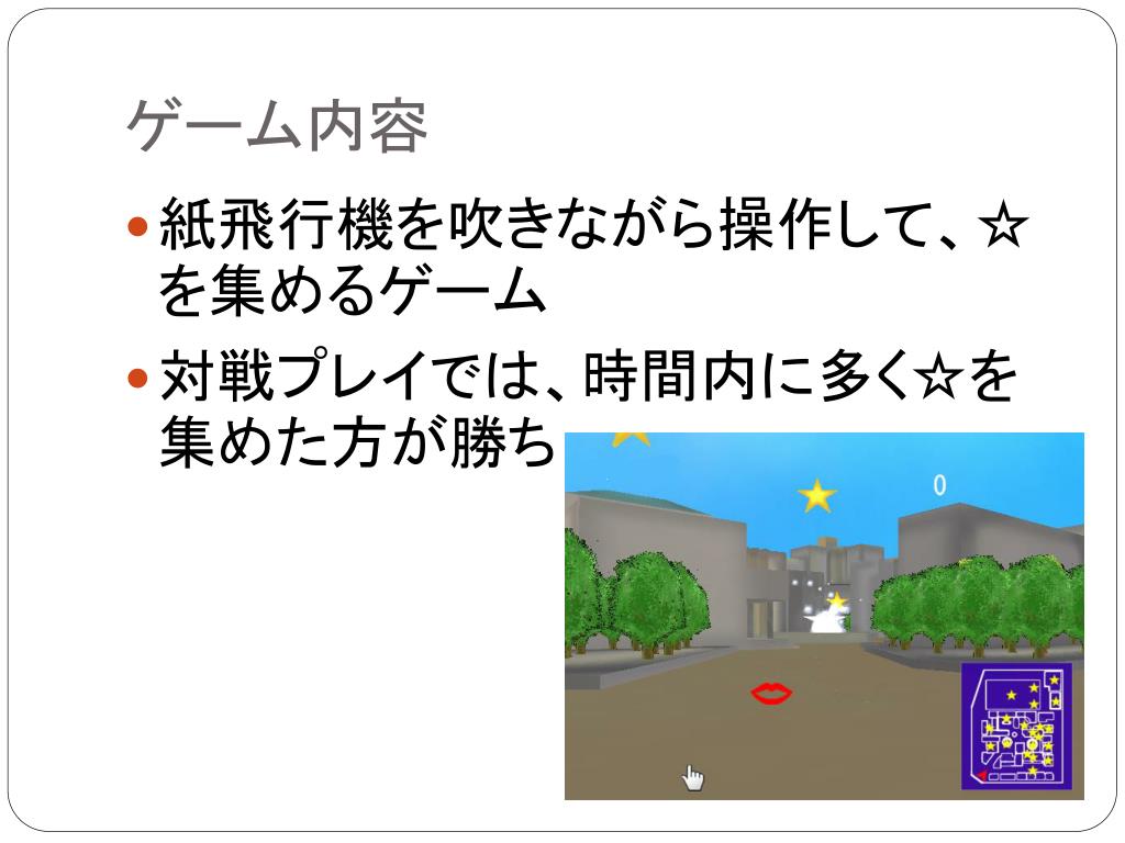 ゲーム内容 • 紙飛行機を吹きながら操作して、☆を集めるゲーム • 対戦プレイでは、時間内に多く☆を集めた方が勝ち