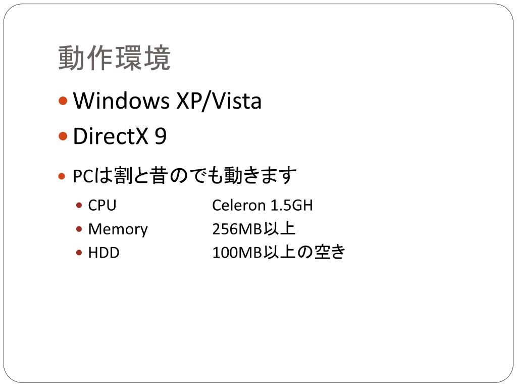 動作環境 • Windows XP/Vista • DirectX 9 • PCは割と昔のでも動きます • CPU Celeron 1.5GH • Memory 256MB以上 • HDD 100MB以上の空き