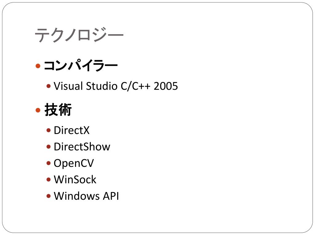 テクノロジー • コンパイラー • Visual Studio C/C++ 2005 • 技術 • DirectX • DirectShow • OpenCV • WinSock • Windows API