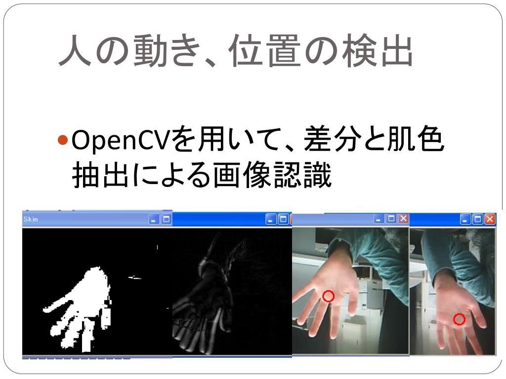 人の動き、位置の検出 • OpenCVを用いて、差分と肌色抽出による画像認識