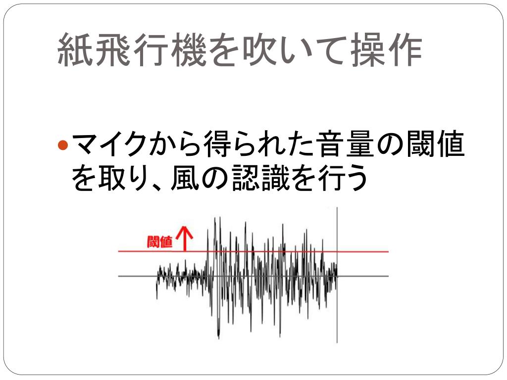 紙飛行機を吹いて操作 • マイクから得られた音量の閾値を取り、風の認識を行う