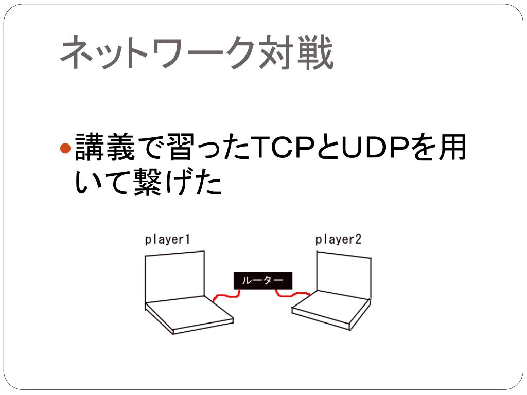ネットワーク対戦 • 講義で習ったTCPとUDPを用いて繋げた