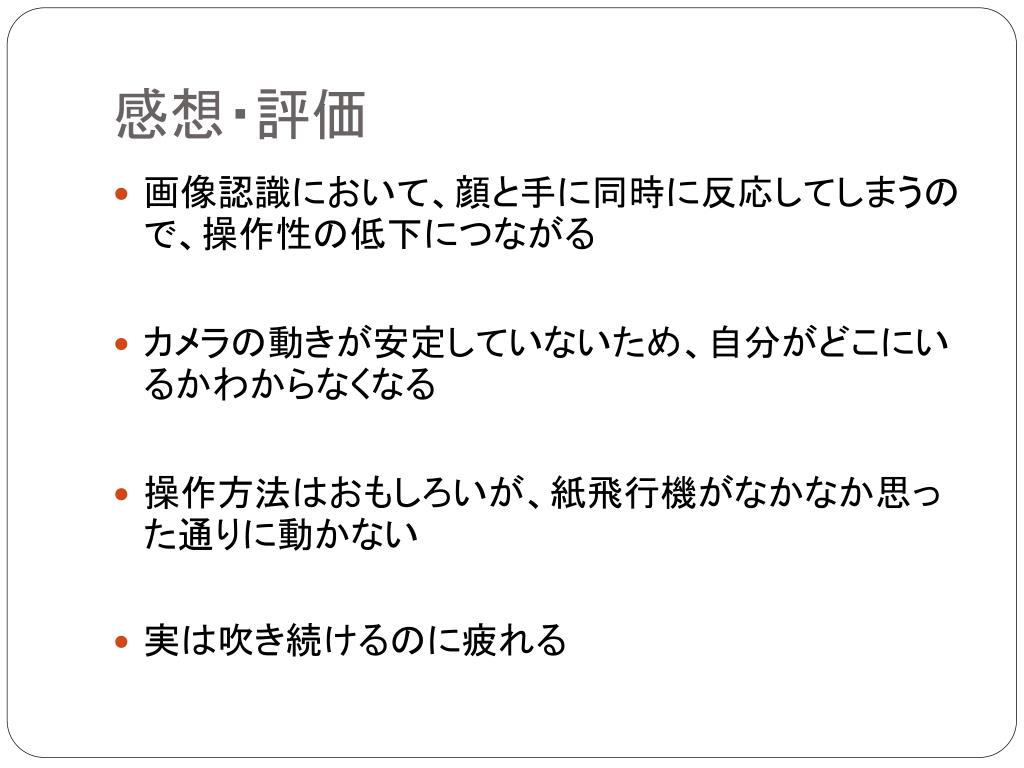 感想・評価 • 画像認識において、顔と手に同時に反応してしまうので、操作性の低下につながる • カメラの動きが安定していないため、自分がどこにいるかわからなくなる • 操作方法はおもしろいが、紙飛行機がなかなか思った通りに動かない • 実は吹き続けるのに疲れる