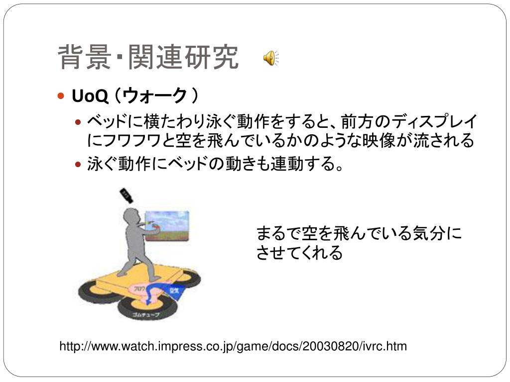 背景・関連研究 • UoQ(ウォーク) • ベッドに横たわり泳ぐ動作をすると、前方のディスプレイにフワフワと空を飛んでいるかのような映像が流される • 泳ぐ動作にベッドの動きも連動する。 まるで空を飛んでいる気分にさせてくれる http://www.watch.impress.co.jp/game/docs/20030820/ivrc.htm