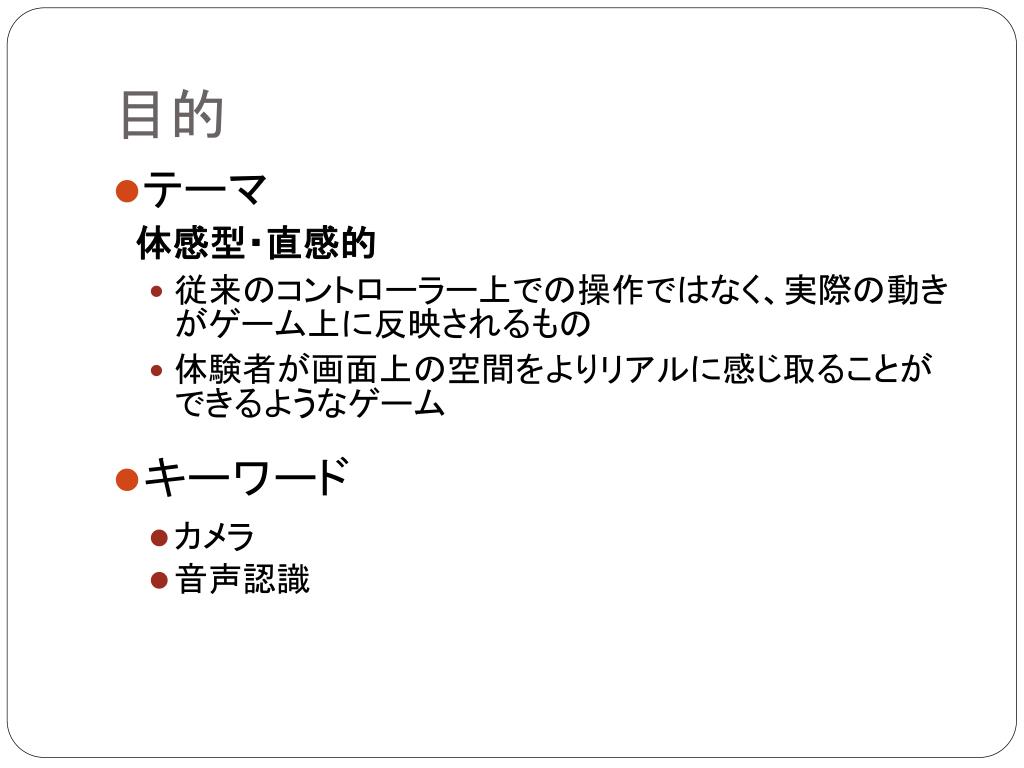 目的 • テーマ 体感型・直感的 • 従来のコントローラー上での操作ではなく、実際の動きがゲーム上に反映されるもの • 体験者が画面上の空間をよりリアルに感じ取ることができるようなゲーム • キーワード • カメラ • 音声認識