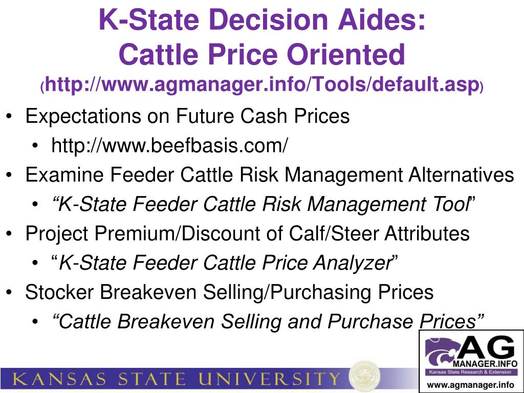 www.agmanager.info K-State Decision Aides: Cattle Price Oriented (http://www.agmanager.info/Tools/default.asp) • Expectations on Future Cash Prices • http://www.beefbasis.com/ • Examine Feeder Cattle Risk Management Alternatives • “K-State Feeder Cattle Risk Management Tool” • Project Premium/Discount of Calf/Steer Attributes • “K-State Feeder Cattle Price Analyzer” • Stocker Breakeven Selling/Purchasing Prices • “Cattle Breakeven Selling and Purchase Prices”