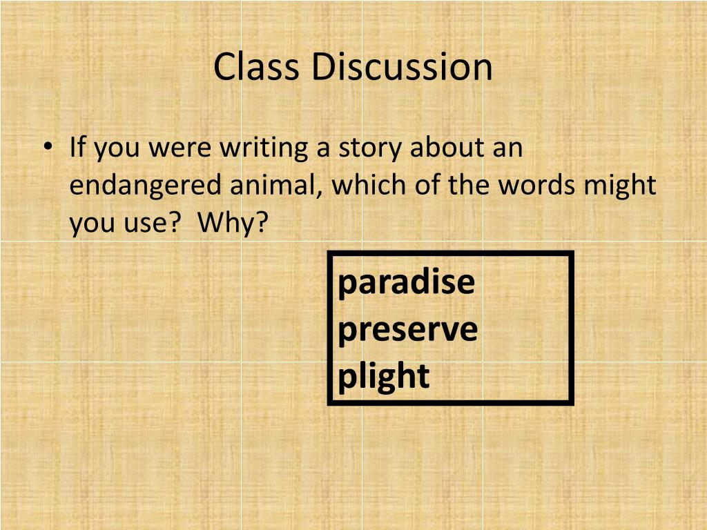 Class Discussion • If you were writing a story about an endangered animal, which of the words might you use? Why? paradise preserve plight