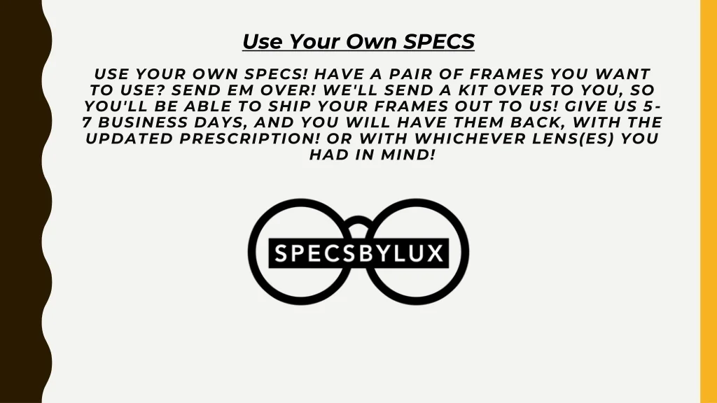 Use Your Own SPECS! Have a pair of frames you want to use? Send em over! We'll send a kit over to you, so you'll be able to ship your frames out to us! Give us 5-7 Business Days, and you will have them back, with the updated prescription! Or with whichever lens(es) you had in mind! Use Your Own SPECS