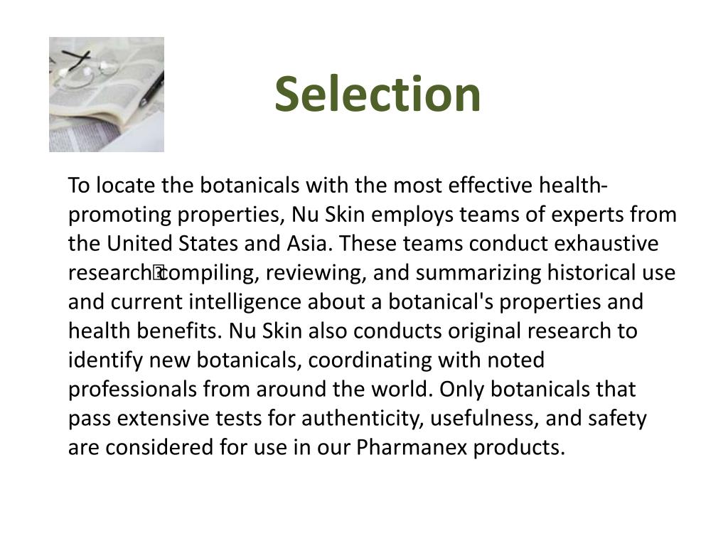 Selection To locate the botanicals with the most effective health-promoting properties, Nu Skin employs teams of experts from the United States and Asia. These teams conduct exhaustive research compiling, reviewing, and summarizing historical use and current intelligence about a botanical's properties and health benefits. Nu Skin also conducts original research to identify new botanicals, coordinating with noted professionals from around the world. Only botanicals that pass extensive tests for authenticity, usefulness, and safety are considered for use in our Pharmanex products.