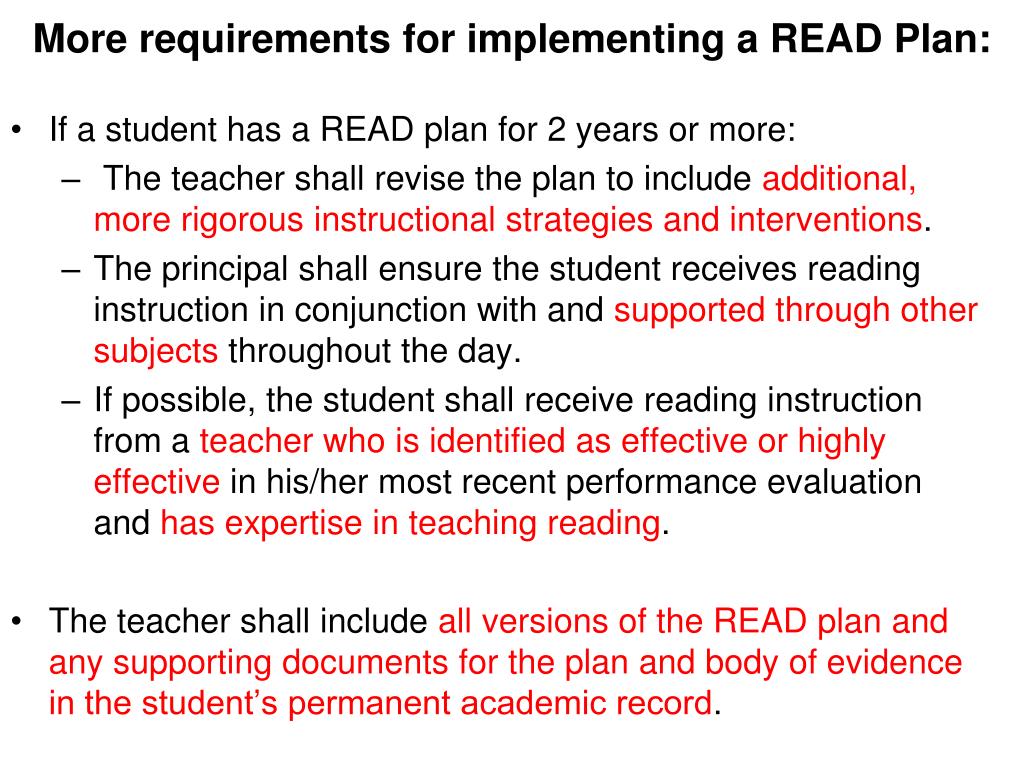 More requirements for implementing a READ Plan: • If a student has a READ plan for 2 years or more: • The teacher shall revise the plan to include additional, more rigorous instructional strategies and interventions. • The principal shall ensure the student receives reading instruction in conjunction with and supported through other subjects throughout the day. • If possible, the student shall receive reading instruction from a teacher who is identified as effective or highly effective in his/her most recent performance evaluation and has expertise in teaching reading. • The teacher shall include all versions of the READ plan and any supporting documents for the plan and body of evidence in the student’s permanent academic record.