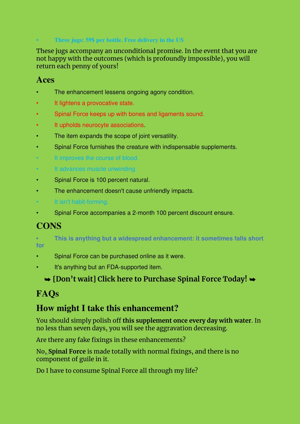 • Three jugs: 59$ per bottle. Free delivery in the US These jugs accompany an unconditional promise. In the event that you are not happy with the outcomes (which is profoundly impossible), you will return each penny of yours! Aces • The enhancement lessens ongoing agony condition. • It lightens a provocative state. • Spinal Force keeps up with bones and ligaments sound. • It upholds neurocyte associations. • The item expands the scope of joint versatility. • Spinal Force furnishes the creature with indispensable supplements. • It improves the course of blood. • It advances muscle unwinding. • Spinal Force is 100 percent natural. • The enhancement doesn't cause unfriendly impacts. • It isn't habit-forming. • CONS Spinal Force accompanies a 2-month 100 percent discount ensure. • for This is anything but a widespread enhancement: it sometimes falls short • Spinal Force can be purchased online as it were. • It's anything but an FDA-supported item. ➥ ➥[Don’t wait] Click here to Purchase Spinal Force Today! ➥ FAQs How might I take this enhancement? ➥ You should simply polish off this supplement once every day with water. In no less than seven days, you will see the aggravation decreasing. Are there any fake fixings in these enhancements? No, Spinal Force is made totally with normal fixings, and there is no component of guile in it. Do I have to consume Spinal Force all through my life?