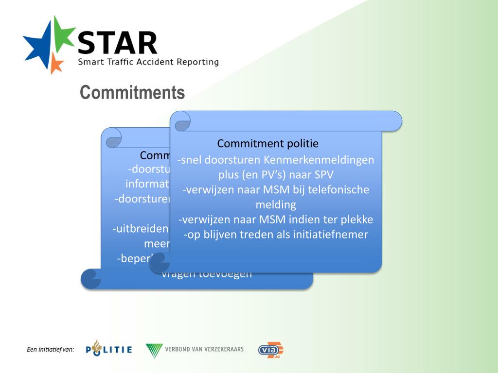 Commitments -doorsturen (geanonimiseerde) informatie vanuit MSM naar VIA -doorsturen (geanonimiseerde) politie informatie vanuit SPV -uitbreiden functionaliteit MSM naar meerdere weggebruikers -beperkt aantal verkeersveiligheids-vragen toevoegen Commitment verzekeraars