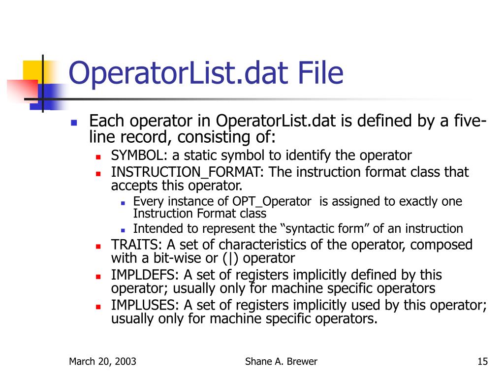 OperatorList.dat File • Each operator in OperatorList.dat is defined by a five-line record, consisting of: • SYMBOL: a static symbol to identify the operator • INSTRUCTION_FORMAT: The instruction format class that accepts this operator. • Every instance of OPT_Operator is assigned to exactly one Instruction Format class • Intended to represent the “syntactic form” of an instruction • TRAITS: A set of characteristics of the operator, composed with a bit-wise or (|) operator • IMPLDEFS: A set of registers implicitly defined by this operator; usually only for machine specific operators • IMPLUSES: A set of registers implicitly used by this operator; usually only for machine specific operators. Shane A. Brewer