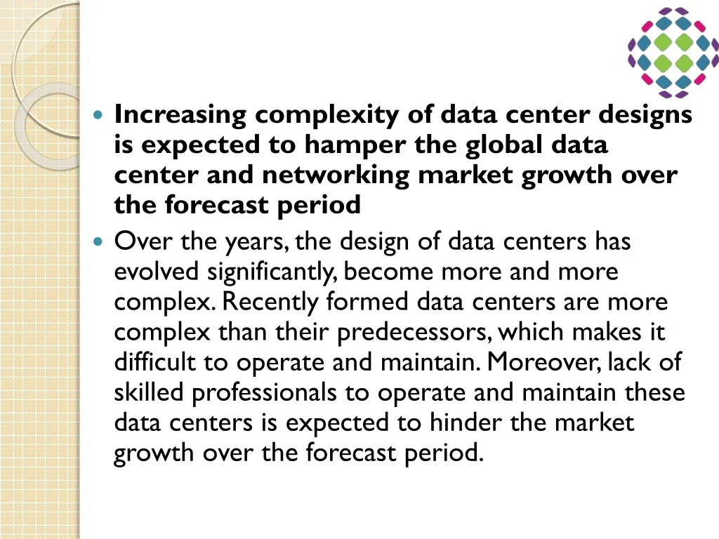 Increasing complexity of data center designs is expected to hamper the global data center and networking market growth over the forecast period • Over the years, the design of data centers has evolved significantly, become more and more complex. Recently formed data centers are more complex than their predecessors, which makes it difficult to operate and maintain. Moreover, lack of skilled professionals to operate and maintain these data centers is expected to hinder the market growth over the forecast period.