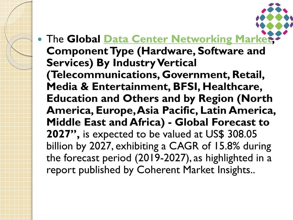 The Global Data Center Networking Market, Component Type (Hardware, Software and Services) By Industry Vertical (Telecommunications, Government, Retail, Media & Entertainment, BFSI, Healthcare, Education and Others and by Region (North America, Europe, Asia Pacific, Latin America, Middle East and Africa) - Global Forecast to 2027”, is expected to be valued at US$ 308.05 billion by 2027, exhibiting a CAGR of 15.8% during the forecast period (2019-2027), as highlighted in a report published by Coherent Market Insights..