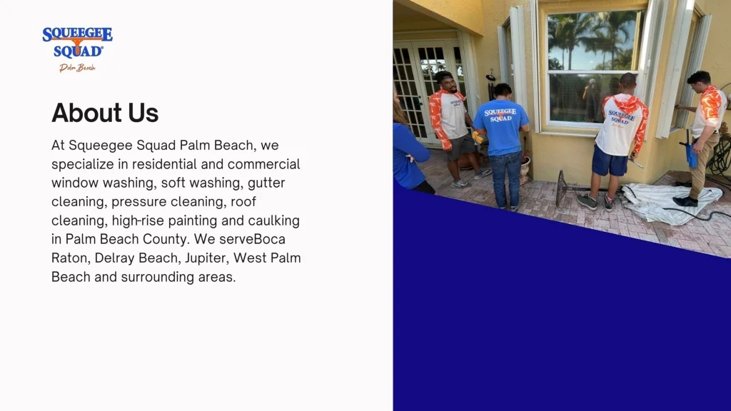 About Us • At Squeegee Squad Palm Beach, we specialize in residential and commercial window washing, soft washing, gutter cleaning, pressure cleaning, roof cleaning, high-rise painting and caulking in Palm Beach County. We serveBoca Raton, Delray Beach, Jupiter, West Palm Beach and surrounding areas.