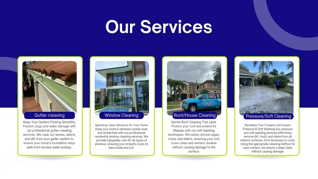Window Cleaning • Gutter cleaning • Pressure/Soft Cleaning • Roof/House Cleaning Our Services • Keep Your Gutters Flowing Smoothly Prevent clogs and water damage with our professional gutter cleaning services. We clear out leaves, debris, and dirt from your gutter system to ensure your home’s foundation stays safe from excess water buildup. • Gentle Roof Cleaning That Lasts Protect your roof and extend its lifespan with our soft washing techniques. We safely remove algae, moss, and debris, ensuring your roof looks clean and remains durable without causing damage to the surface. • Sparkling Clean Windows for Your Home Keep your home’s windows crystal clear and streak-free with our professional residential window cleaning services. We provide top-quality care for all types of windows, ensuring your property looks its best inside and out. • Revitalize Your Property with Expert Pressure & Soft Washing Our pressure and soft washing services effectively remove dirt, mold, and stains from all exterior surfaces, from driveways to roofs. Using the appropriate cleaning method for each surface, we ensure a deep clean without causing damage.