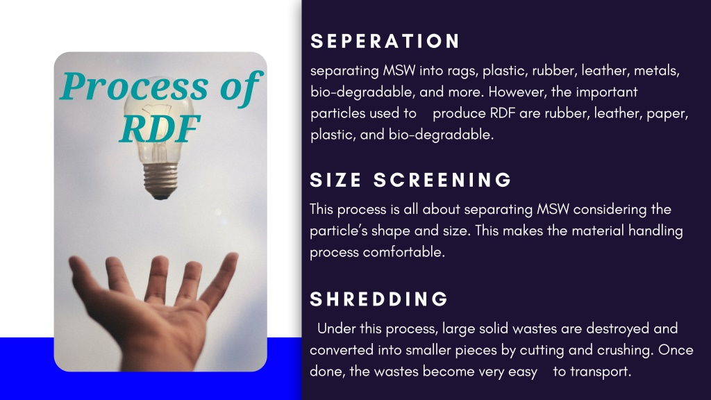 SEPERATION separating MSW into rags, plastic, rubber, leather, metals, bio-degradable, and more. However, the important particles used to produce RDF are rubber, leather, paper, plastic, and bio-degradable. Process of RDF SIZE SCREENING This process is all about separating MSW considering the particle’s shape and size. This makes the material handling process comfortable. SHREDDING Under this process, large solid wastes are destroyed and converted into smaller pieces by cutting and crushing. Once done, the wastes become very easy to transport.