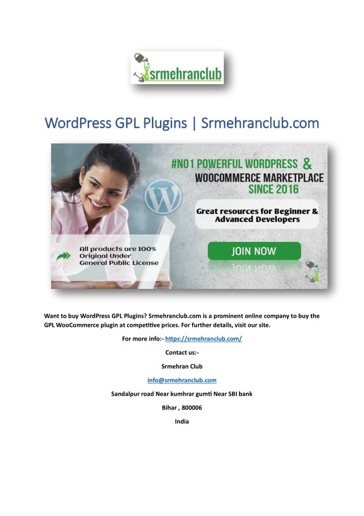 1. WordPress GPL Plugins | Srmehranclub.com WordPress GPL Plugins | Srmehranclub.com Want to buy WordPress GPL Plugins? Srmehranclub.com is a prominent online company to buy the GPL WooCommerce plugin at competitive prices. For further details, visit our site. For more info:- https://srmehranclub.com/ Contact us:- Srmehran Club info@srmehranclub.com Sandalpur road Near kumhrar gumti Near SBI bank Bihar ,800006 India