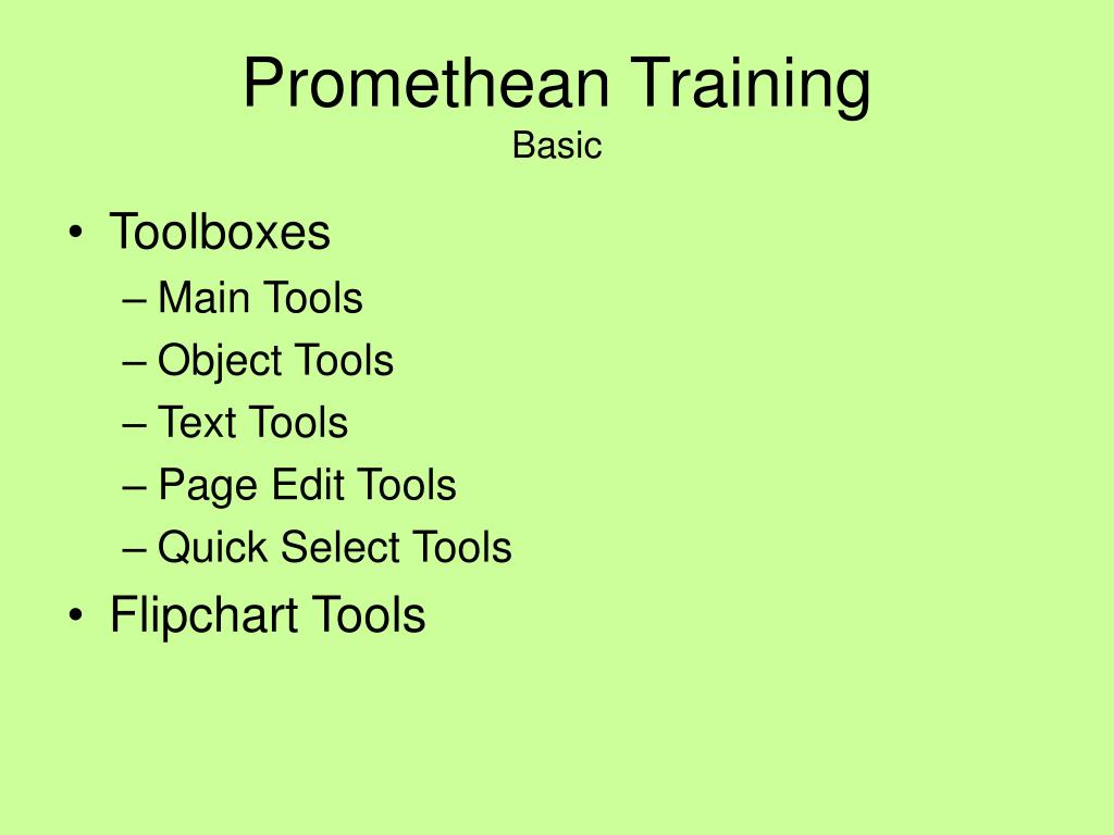 Promethean Training Basic • Toolboxes • Main Tools • Object Tools • Text Tools • Page Edit Tools • Quick Select Tools • Flipchart Tools