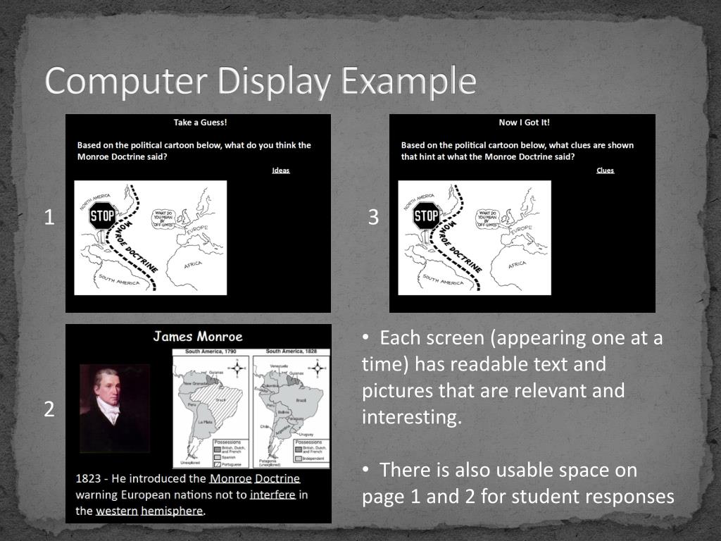 Computer Display Example 1 3 • Each screen (appearing one at a time) has readable text and pictures that are relevant and interesting. • There is also usable space on page 1 and 2 for student responses 2