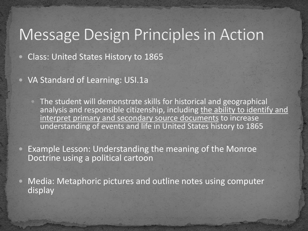 Message Design Principles in Action • Class: United States History to 1865 • VA Standard of Learning: USI.1a • The student will demonstrate skills for historical and geographical analysis and responsible citizenship, including the ability to identify and interpret primary and secondary source documents to increase understanding of events and life in United States history to 1865 • Example Lesson: Understanding the meaning of the Monroe Doctrine using a political cartoon • Media: Metaphoric pictures and outline notes using computer display