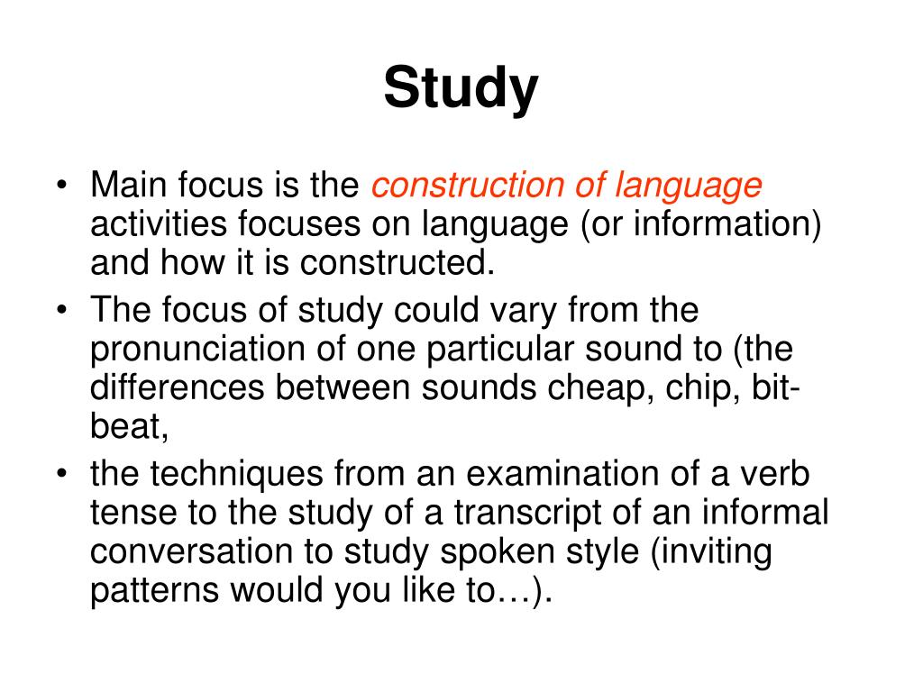 Study • Main focus is the construction of languageactivities focuses on language (or information) and how it is constructed. • The focus of study could vary from the pronunciation of one particular sound to (the differences between sounds cheap, chip, bit-beat, • the techniques from an examination of a verb tense to the study of a transcript of an informal conversation to study spoken style (inviting patterns would you like to…).
