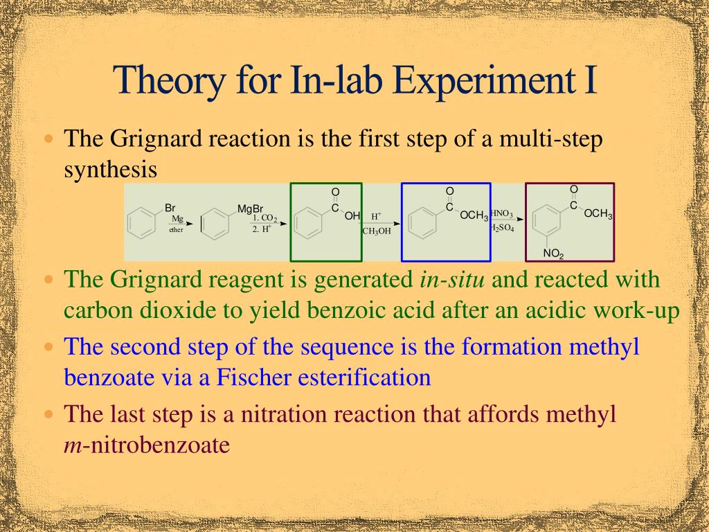 Theory for In-lab Experiment I • The Grignard reaction is the first step of a multi-step synthesis • The Grignard reagent is generated in-situ and reacted with carbon dioxide to yield benzoic acid after an acidic work-up • The second step of the sequence is the formation methyl benzoate via a Fischer esterification • The last step is a nitration reaction that affords methyl m-nitrobenzoate