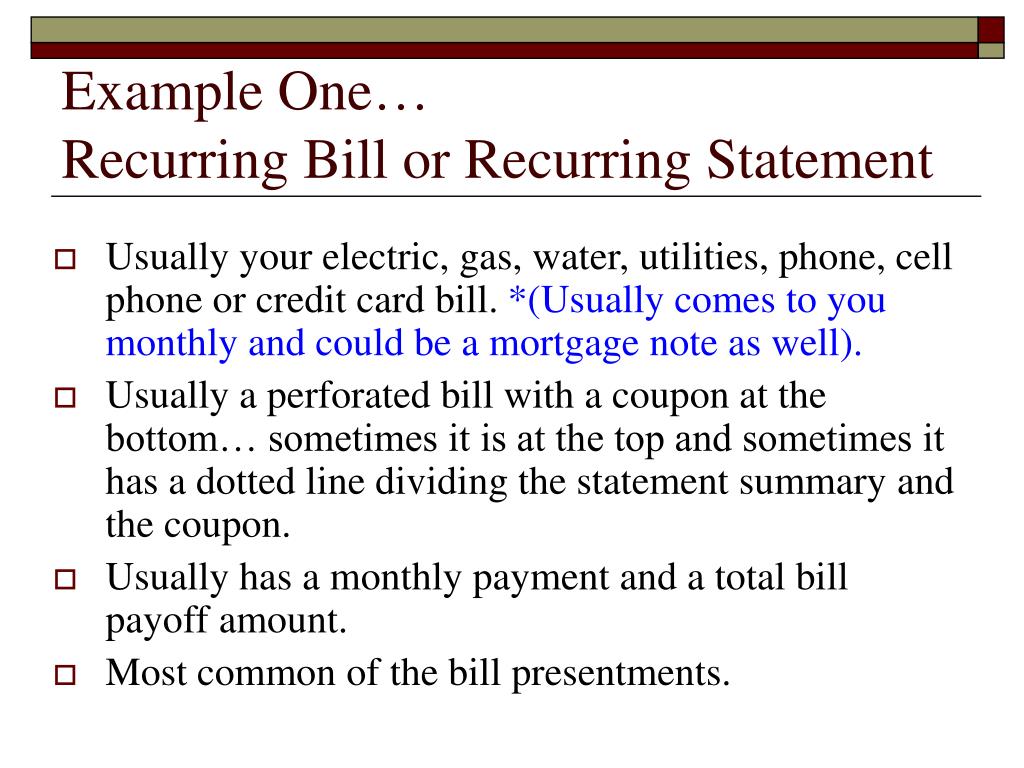 Example One…Recurring Bill or Recurring Statement • Usually your electric, gas, water, utilities, phone, cell phone or credit card bill. *(Usually comes to you monthly and could be a mortgage note as well). • Usually a perforated bill with a coupon at the bottom… sometimes it is at the top and sometimes it has a dotted line dividing the statement summary and the coupon. • Usually has a monthly payment and a total bill payoff amount. • Most common of the bill presentments.
