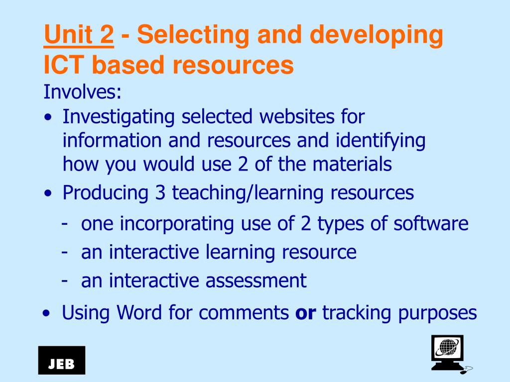 Unit 2 - Selecting and developing ICT based resources Involves: • Investigating selected websites for information and resources and identifying how you would use 2 of the materials • Producing 3 teaching/learning resources • one incorporating use of 2 types of software • an interactive learning resource • an interactive assessment • Using Word for comments or tracking purposes