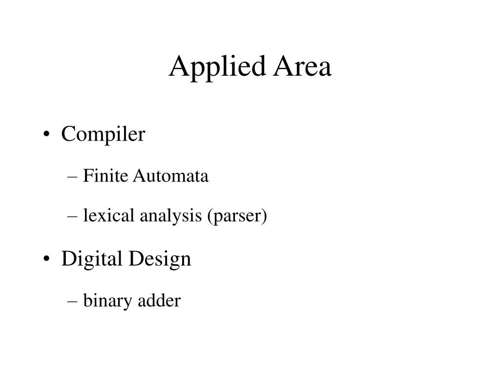 Applied Area • Compiler • Finite Automata • lexical analysis (parser) • Digital Design • binary adder