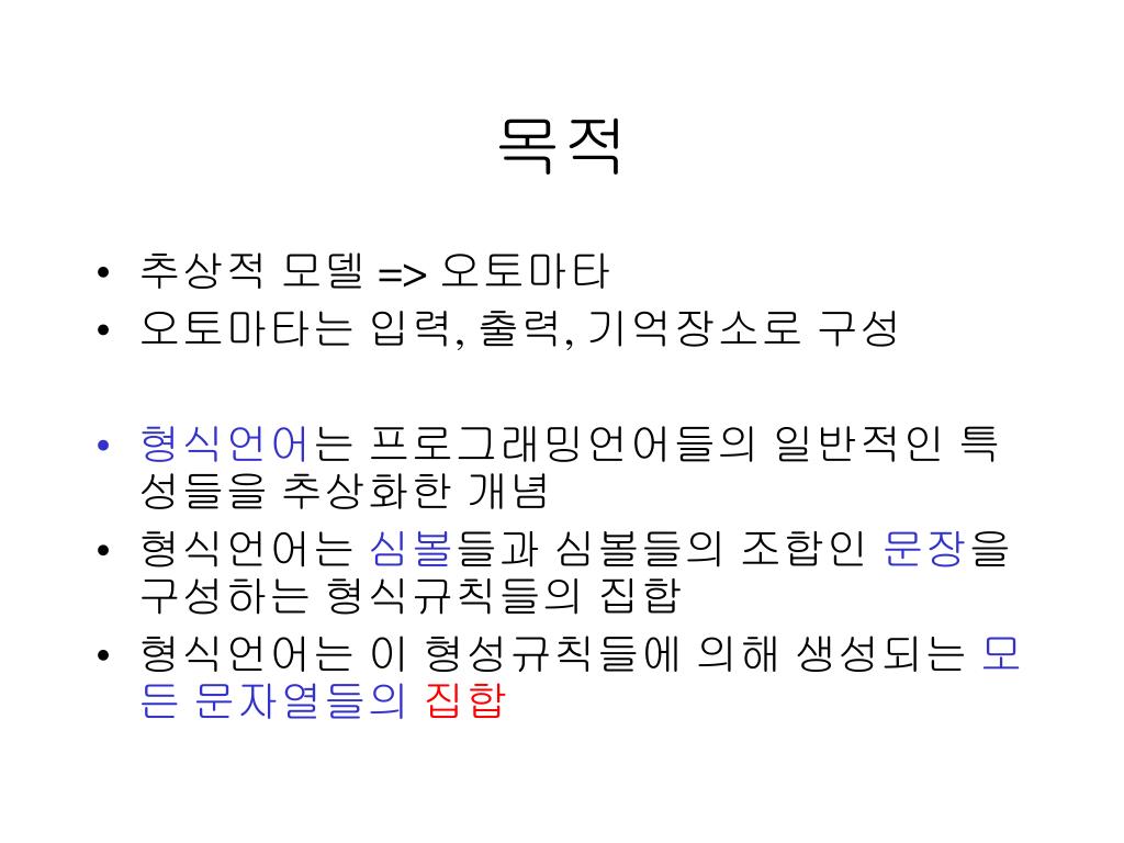 목적 • 추상적 모델 => 오토마타 • 오토마타는 입력, 출력, 기억장소로 구성 • 형식언어는 프로그래밍언어들의 일반적인 특성들을 추상화한 개념 • 형식언어는 심볼들과 심볼들의 조합인 문장을 구성하는 형식규칙들의 집합 • 형식언어는 이 형성규칙들에 의해 생성되는 모든 문자열들의 집합
