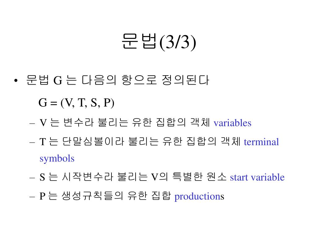 문법(3/3) • 문법 G 는 다음의 항으로 정의된다 G = (V, T, S, P) • V 는 변수라 불리는 유한 집합의 객체 variables • T 는 단말심볼이라 불리는 유한 집합의 객체 terminal symbols • S 는 시작변수라 불리는 V의 특별한 원소 start variable • P 는 생성규칙들의 유한 집합 productions