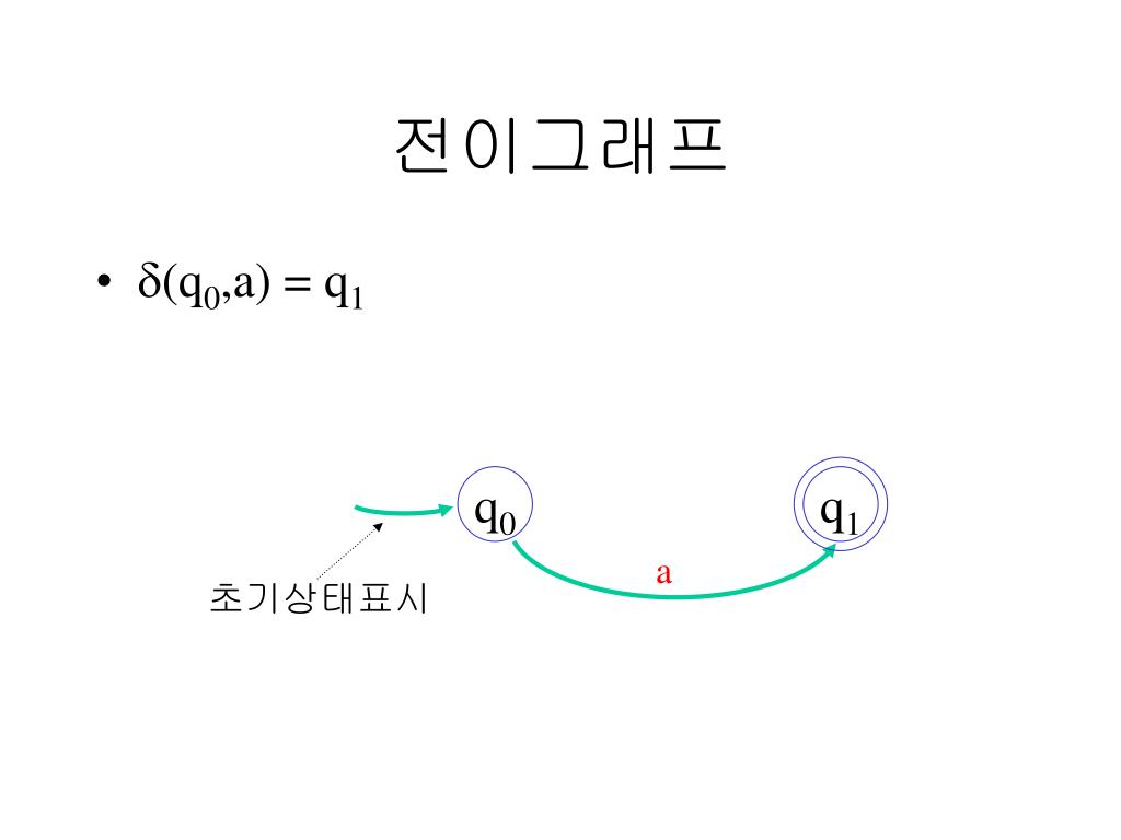 전이그래프 • (q0,a) = q1 q0 q1 a 초기상태표시