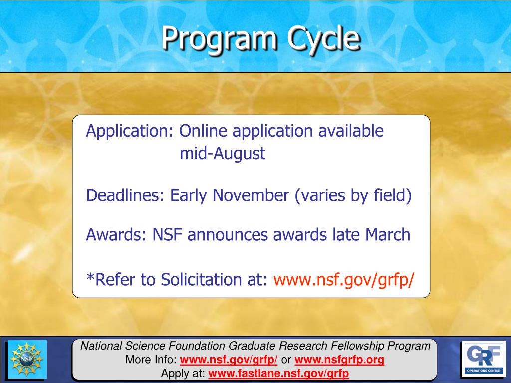 Program Cycle Application: Online application available mid-August Deadlines: Early November (varies by field) Awards: NSF announces awards late March *Refer to Solicitation at: www.nsf.gov/grfp/
