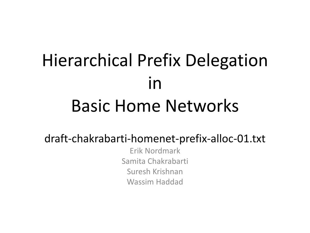 Hierarchical Prefix DelegationinBasic Home Networks draft-chakrabarti-homenet-prefix-alloc-01.txt Erik Nordmark SamitaChakrabarti Suresh Krishnan Wassim Haddad