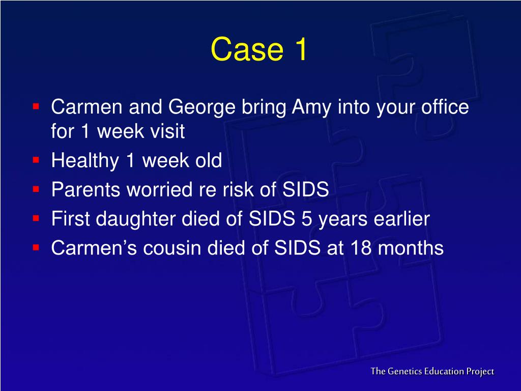 Case 1 • Carmen and George bring Amy into your office for 1 week visit • Healthy 1 week old • Parents worried re risk of SIDS • First daughter died of SIDS 5 years earlier • Carmen’s cousin died of SIDS at 18 months