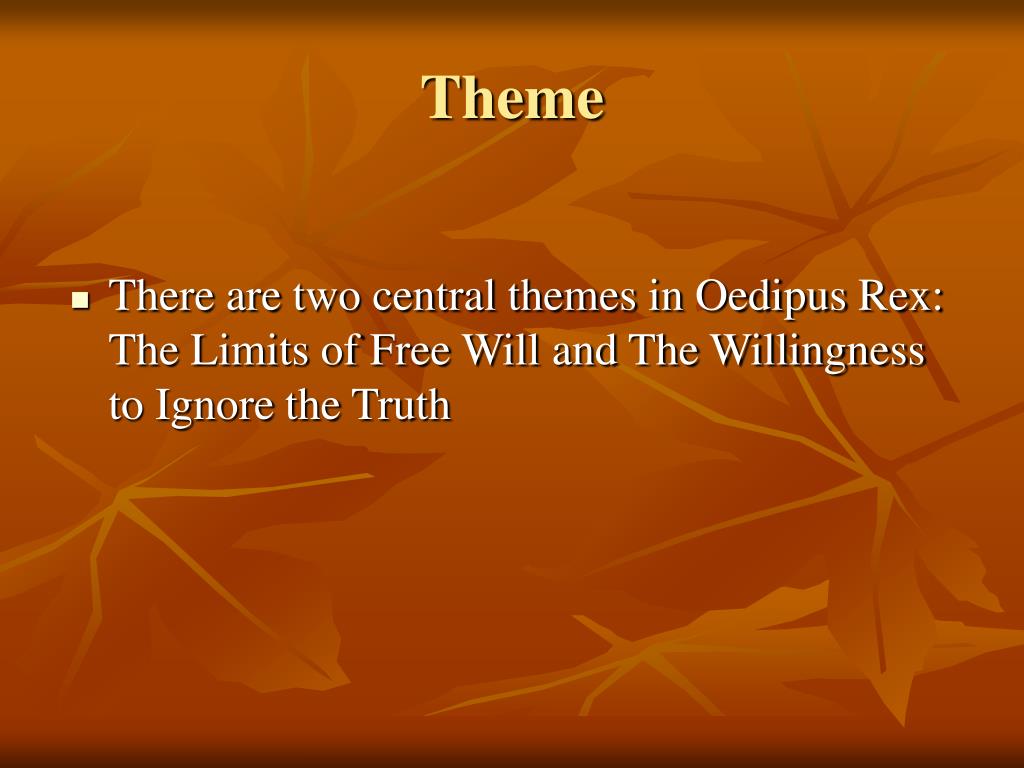Theme • There are two central themes in Oedipus Rex: The Limits of Free Will and The Willingness to Ignore the Truth