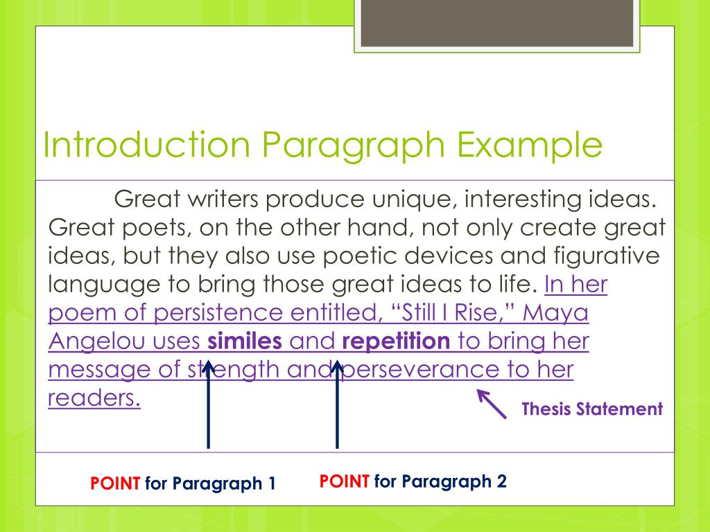 Introduction Paragraph Example Great writers produce unique, interesting ideas. Great poets, on the other hand, not only create great ideas, but they also use poetic devices and figurative language to bring those great ideas to life. In her poem of persistence entitled, “Still I Rise,” Maya Angelou uses similes and repetition to bring her message of strength and perseverance to her readers. Thesis Statement POINT for Paragraph 2 POINTfor Paragraph 1