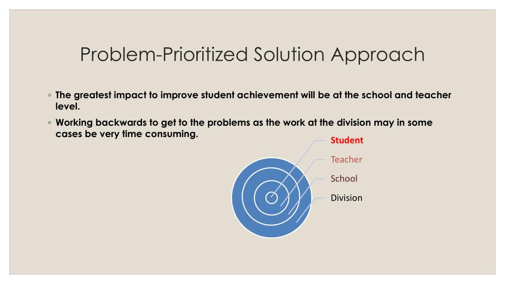 Problem-Prioritized Solution Approach • The greatest impact to improve student achievement will be at the school and teacher level. • Working backwards to get to the problems as the work at the division may in some cases be very time consuming.