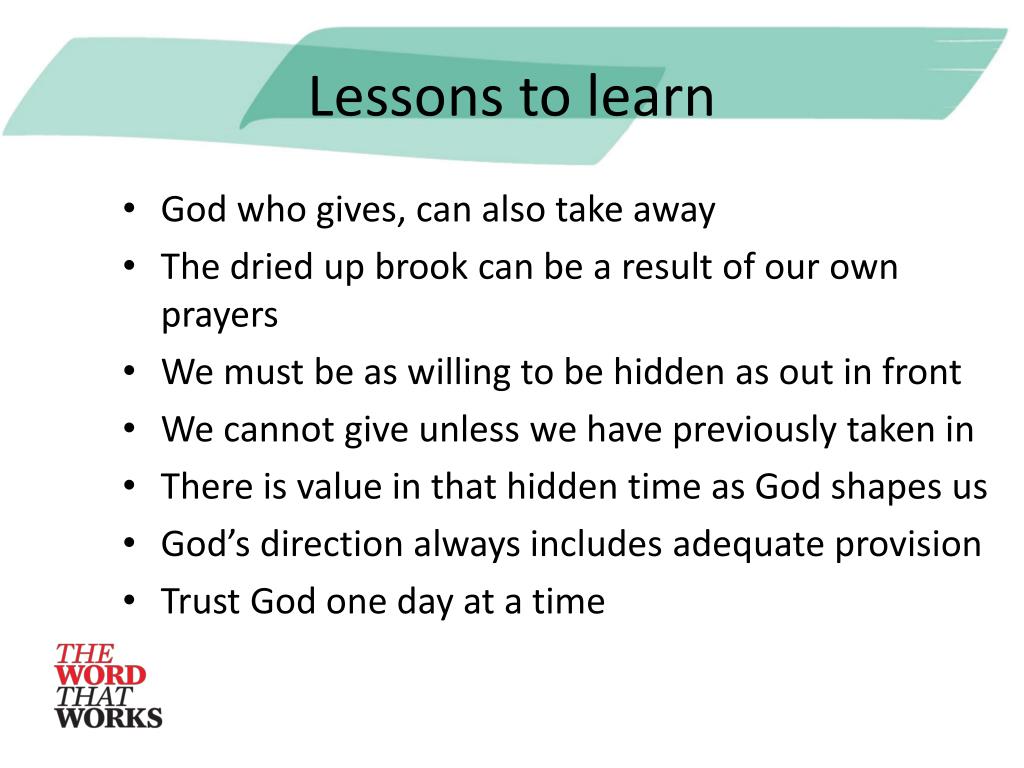 Lessons to learn • God who gives, can also take away • The dried up brook can be a result of our own prayers • We must be as willing to be hidden as out in front • We cannot give unless we have previously taken in • There is value in that hidden time as God shapes us • God’s direction always includes adequate provision • Trust God one day at a time
