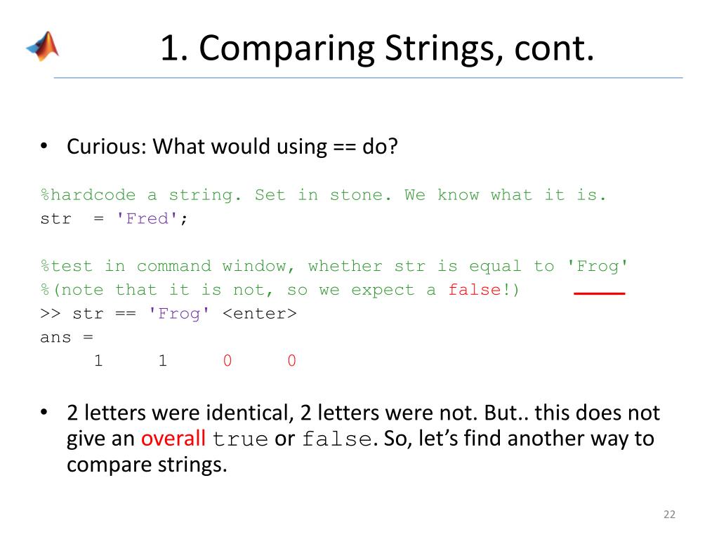 1. Comparing Strings • Curious: What would using == do? %hardcode a string. Set in stone. We know what it is. str = 'Fred'; %test in command window, whether str is equal to 'Fred' %(note that it is, so we expect a true!) >> str == 'Fred' <enter>