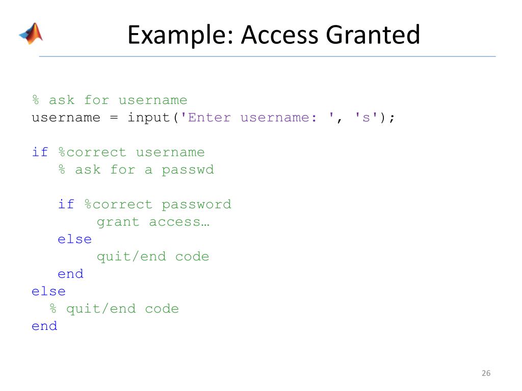 Example: Access Granted % ask for username username = input('Enter username: ', 's'); if %correct username % ask for a passwd if %correct password grant access… else quit/end code end else % quit/end code end