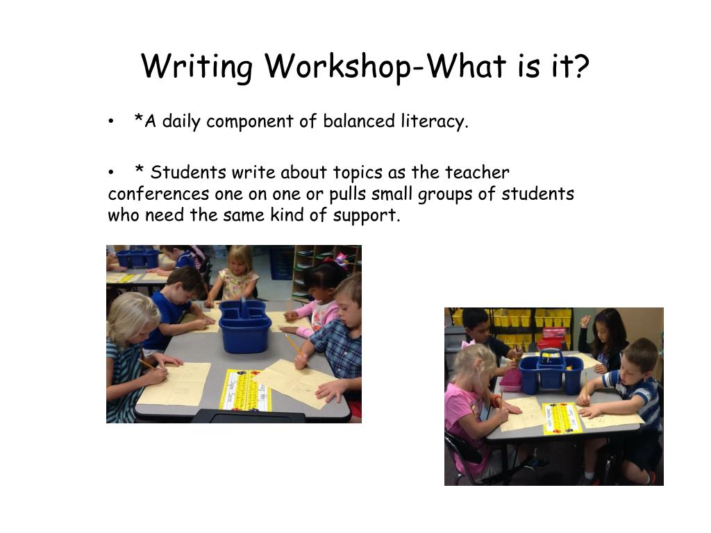 Writing Workshop-What is it? • *A daily component of balanced literacy. • * Students write about topics as the teacher conferences one on one or pulls small groups of students who need the same kind of support.