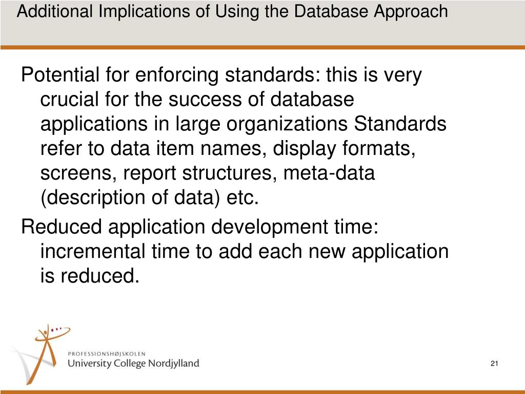 Additional Implications of Using the Database Approach • Potential for enforcing standards: this is very crucial for the success of database applications in large organizations Standards refer to data item names, display formats, screens, report structures, meta-data (description of data) etc. • Reduced application development time: incremental time to add each new application is reduced.