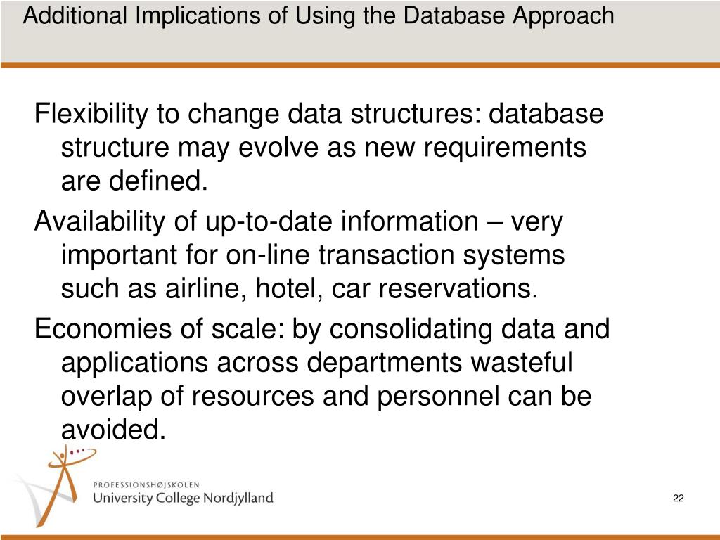 Additional Implications of Using the Database Approach • Flexibility to change data structures: database structure may evolve as new requirements are defined. • Availability of up-to-date information – very important for on-line transaction systems such as airline, hotel, car reservations. • Economies of scale: by consolidating data and applications across departments wasteful overlap of resources and personnel can be avoided.